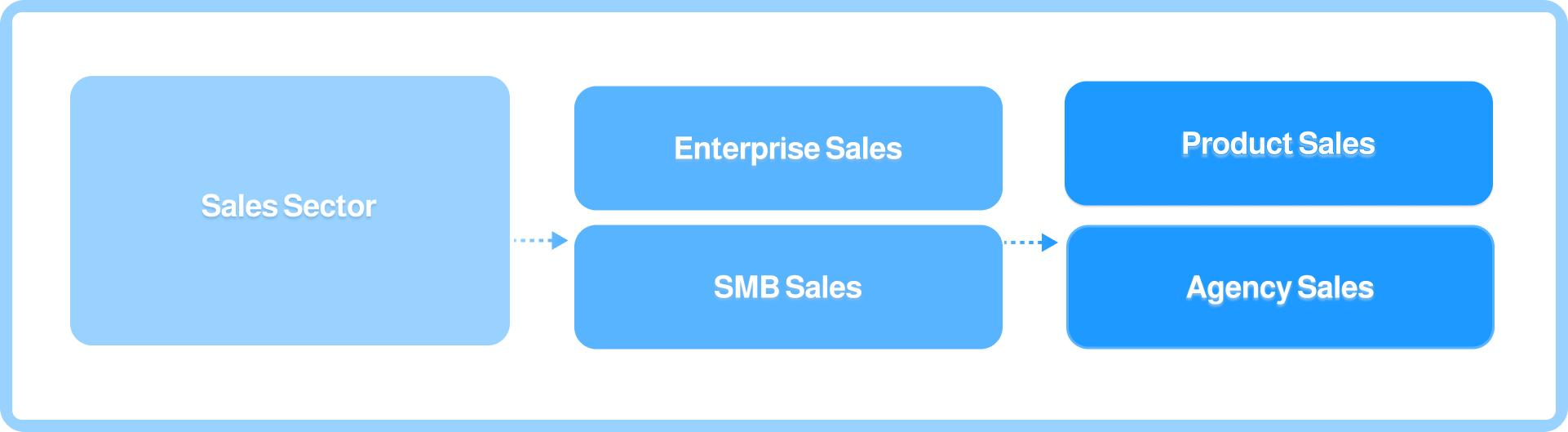 초반에는 세일즈 조직을 SMB 고객을 중심으로 운영했습니다. 하지만 SMB 고객만으로는 매출 성장에 한계가 있다는 사실에 직면했고, 규모가 더 큰 고객군도 함께 다루기 위해 Enterprise Sales / SMB Sales 의 형태로 구조를 나누게 되었습니다. 그러나 실제로 중간 규모의 엔터프라이즈인 Mid-market 까지의 고객군은 SMB 와 크게 다르지 않았고, 이로 인해 고객군에 따른 구분이 실질적인 차별화를 만들어내지 못했습니다.