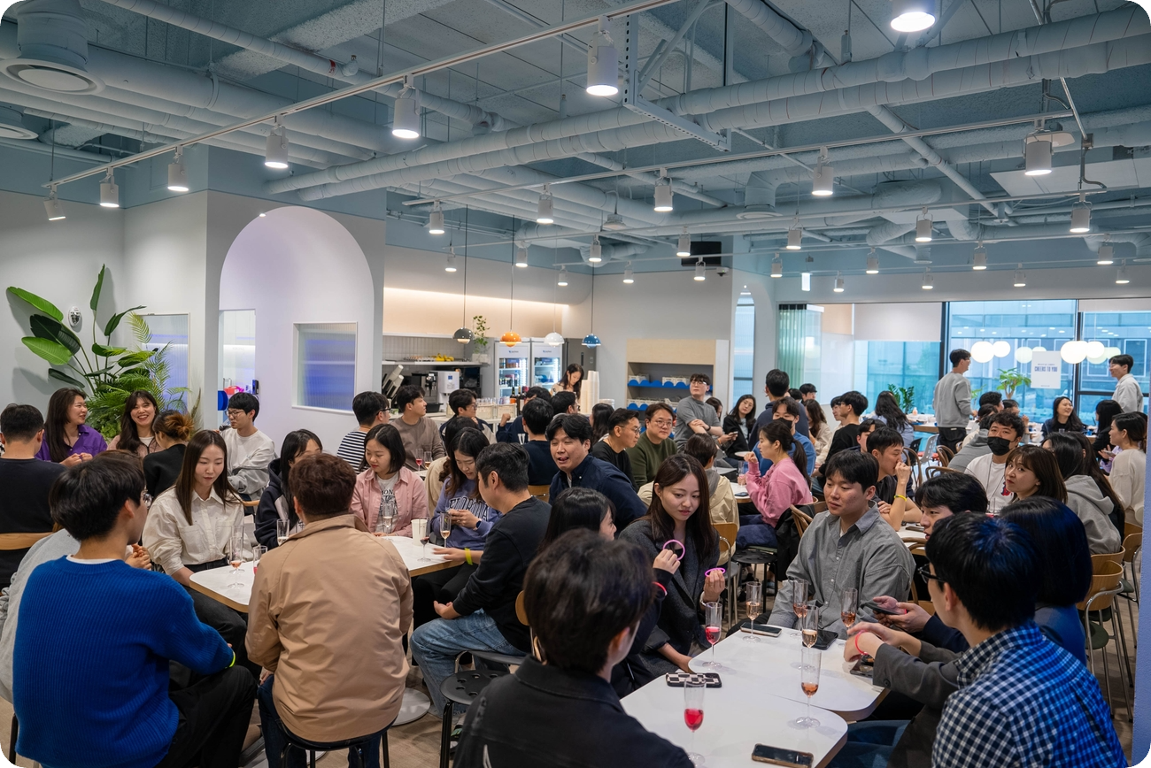 라운지에서 북적북적 모여, 각 팀별로 이야기를 나누는 시간을 가졌습니다. 평소에는 가벼운 미팅이나 식사하는 공간으로 사용이 되다가, 이렇게 대규모로 식사를 하는 공간이 되니 더 새로운 생동감이 느껴지는 시간이었어요. 사진으로만 봐도 그 현장감이 느껴지는 것 같습니다.
