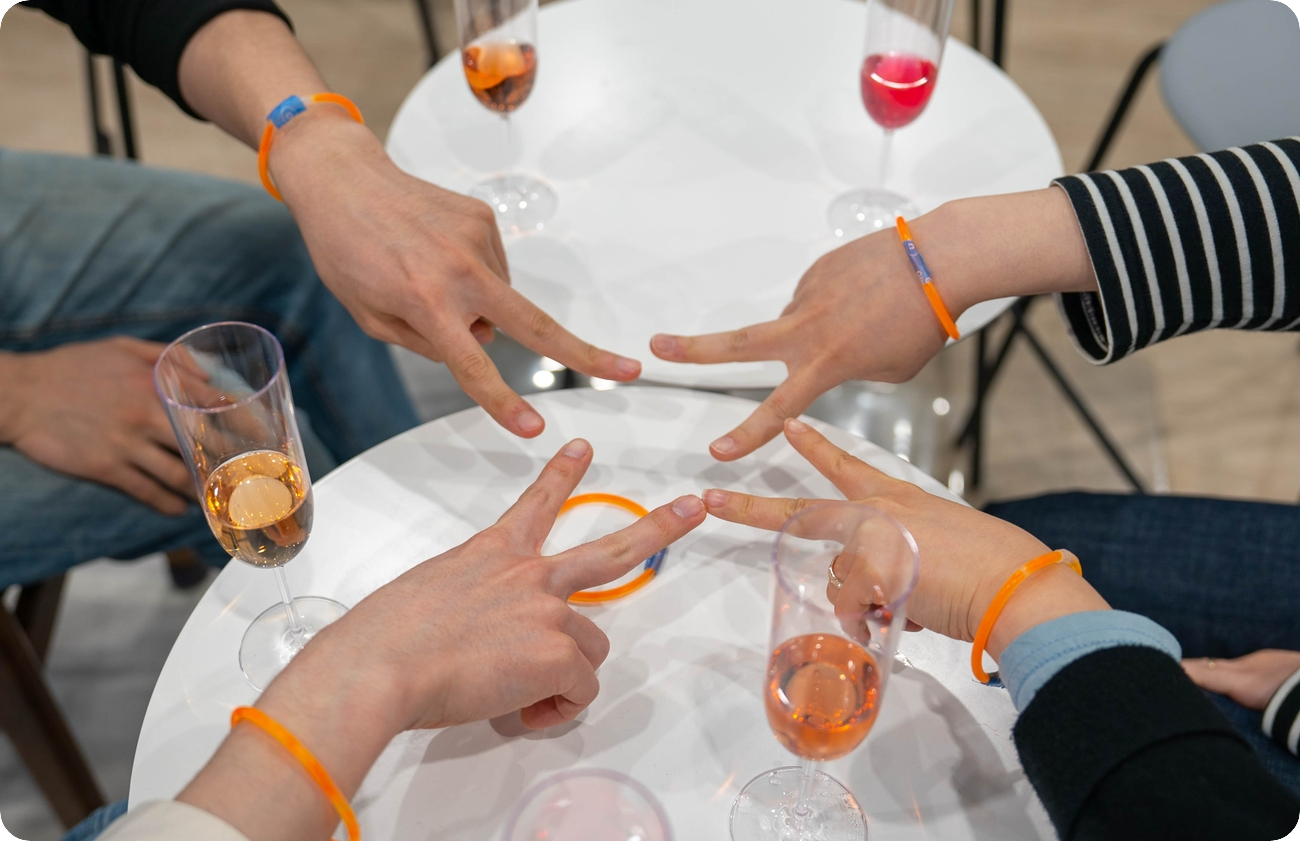 그래서 새로 오신 분들과 기존에 계셨던 분들이 함께 섞어서 앉으실 수 있도록 배치했고, 이에 대한 구분은 형광 팔찌 색깔에 대한 구분으로 진행했습니다. 같은 색깔 팔찌를 차고 있는 동료를 찾아서, 함께 앉으실 수 있도록 했죠.