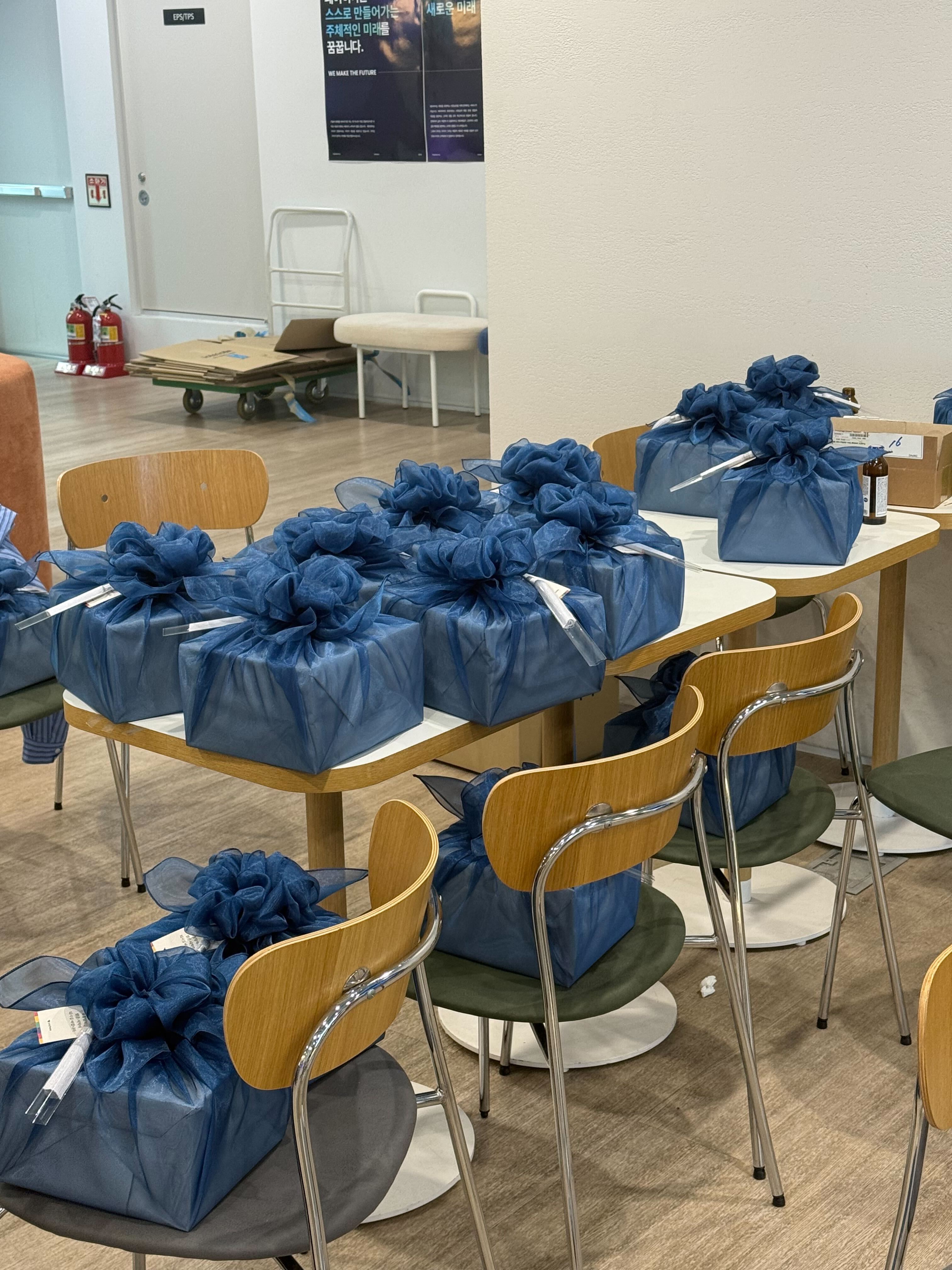 마케팅 팀원들이 오피스 라운지에 모여 직접 포장을 해 주셨습니다.
