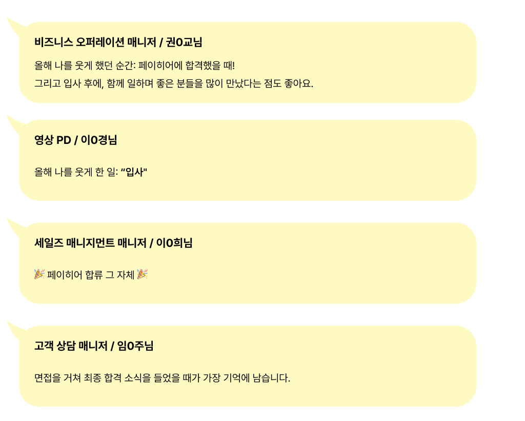 좋은 분들을 모시기 위해 노력하는 만큼, 신규 입사자 분들이 페이히어에 합류하시는 순간은 저희 피플팀 역시 매번 기억에 남는 순간인데요. 입사라는 순간이 이렇게 긍정적으로 기억되고 있다는 점이 인상 깊었습니다.