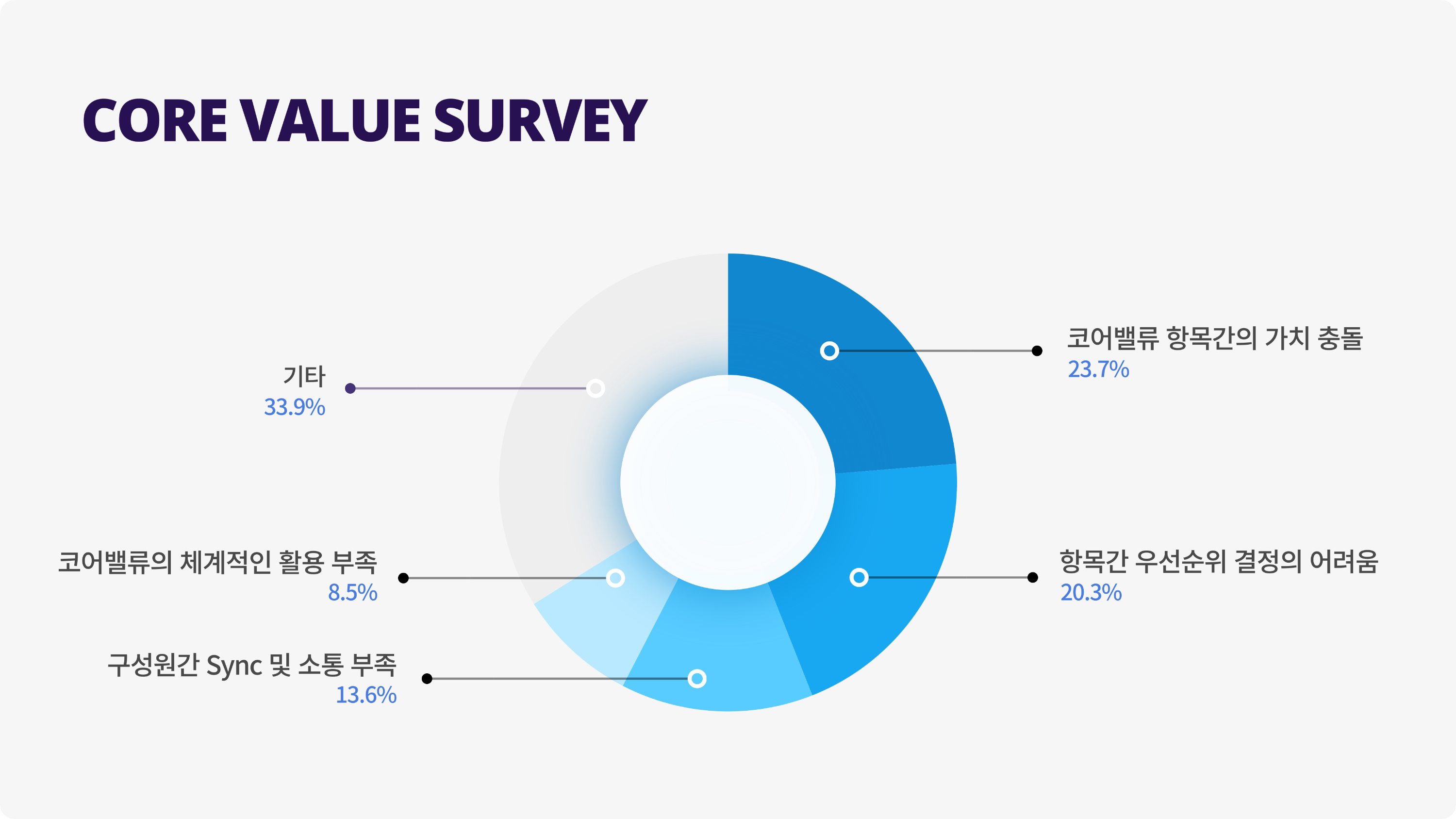 설문조사에서 가장 눈에 띄었던 부분은 단연 ‘현재 잘 지켜지지 않는 코어 밸류 항목과 그 원인’에 대한 것이었습니다. 잘 지켜지지 않고 있는 코어 밸류 항목에 관해서는 부서마다, 또 개인마다 느끼는 부분이 다르다보니 응답이 골고루 분포되어 있었어요. 이유 역시 다양한 의견을 주셨지만, 가장 공통적으로 느낀 원인은 크게 네 가지였습니다.
