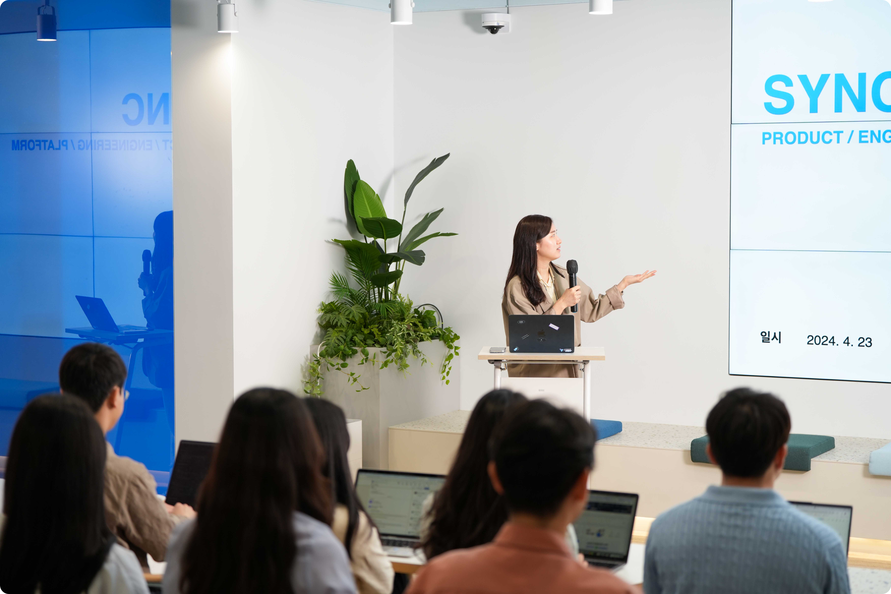 16층 라운지에서 타운홀 미팅인 Sync와 다양한 전사 행사를 진행하고 있습니다. Tech 세미나, 부서별 미팅, 릴리즈(신규 기능 안내) 미팅 등 필요에 따라 누구든 자유롭게 라운지를 이용할 수 있어요.