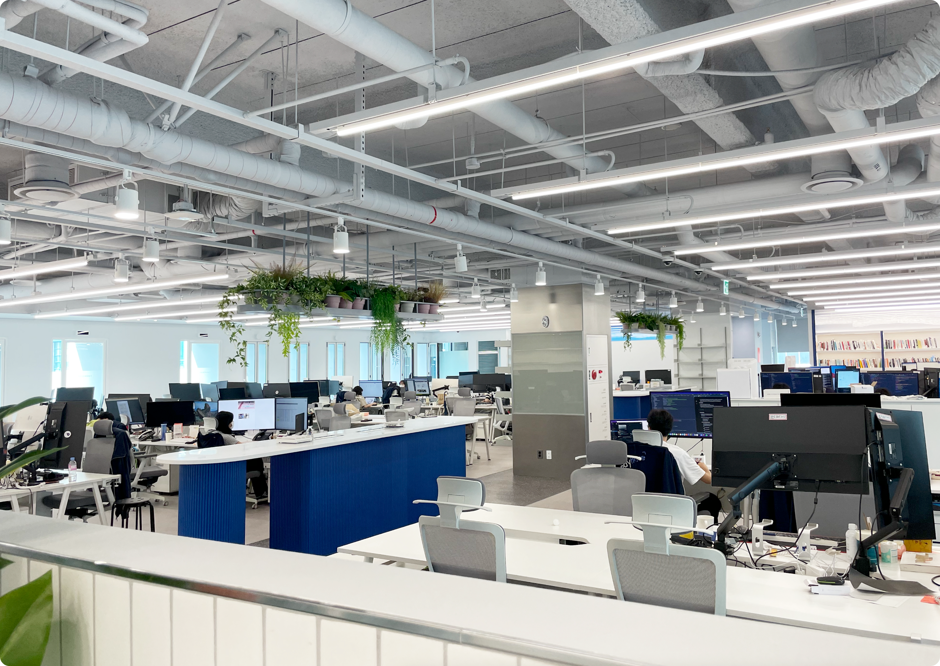 또한, 원활한 협업과 자유로운 이동을 위해 파티션이 없는 오픈형 사무실 구조로 이루어져 있습니다. 가장 많은 시간을 보내게 되는 개인의 업무 공간은 여유롭게 사용하실 수 있도록 넓은 책상과 편한 의자를 제공하고 있어요.