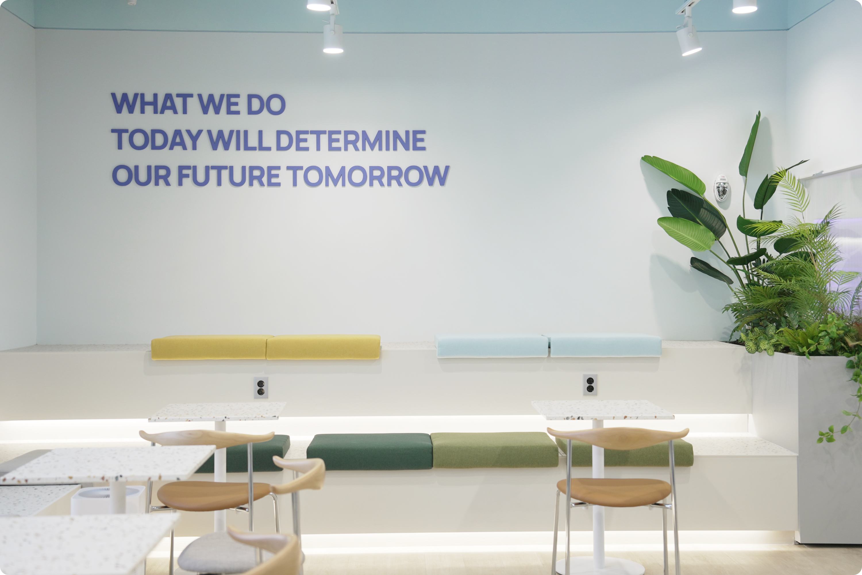라운지 측면에는 간단한 간식과 음료가 구비되어 있으며, 휴게 공간 또한 마련되어 있어요. 많은 구성원이 티타임을 가지며 환기하고 있습니다. 라운지의 메인 사이니지에는 새로운 미래를 만들자는 문구도 있어요.