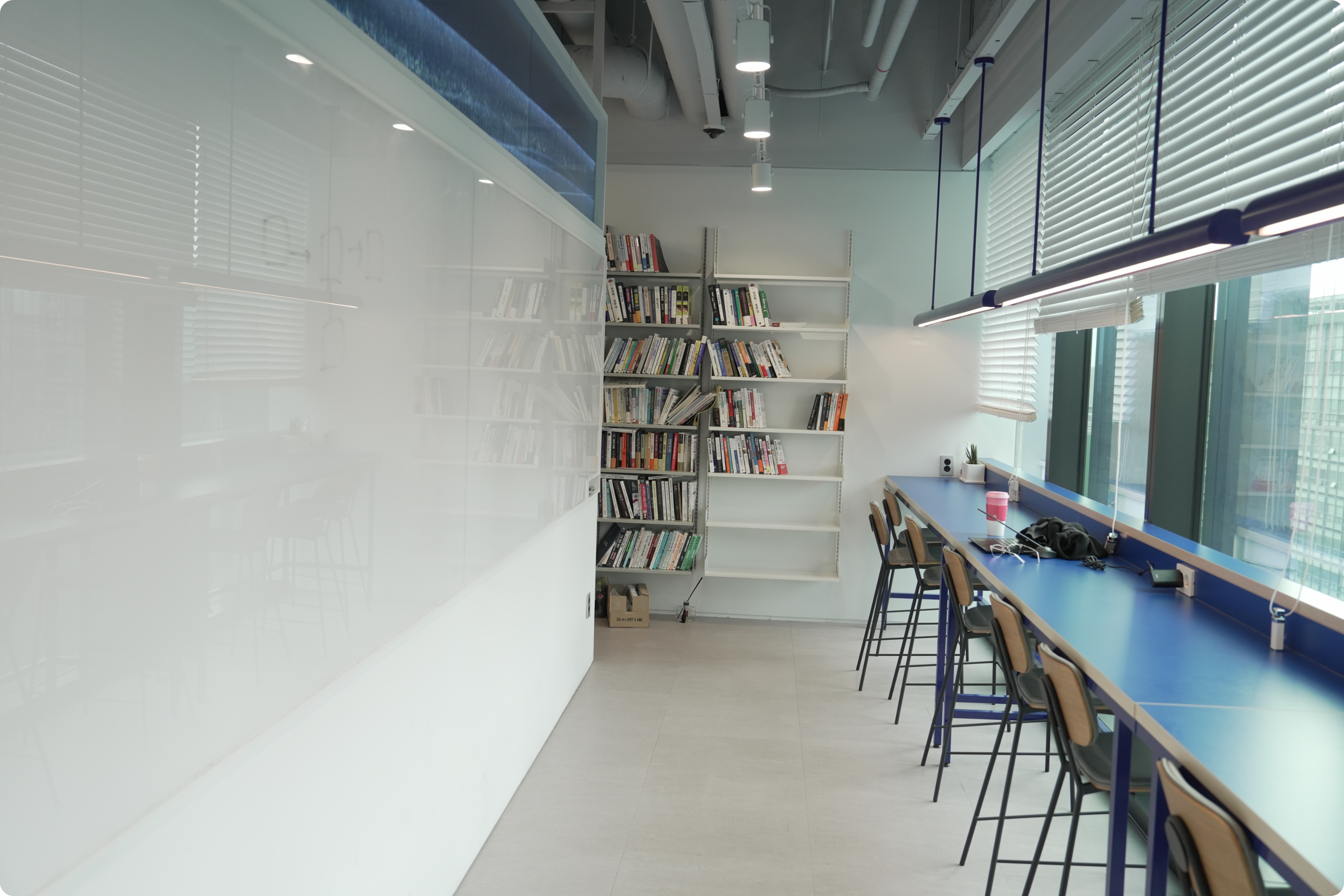 외부의 소음없이 편안히 업무상 필요한 전화 통화를 할 수 있는 폰부스와, 치열한 몰입이 필요한 순간에 자유롭게 이용할 수 있는 포커스룸입니다. 포커스룸의 경우 내부가 보이지 않는 어두운 문과, 높낮이 조절이 가능한 모션데스크를 설치하여 온전히 업무에 몰입할 수 있는 공간을 조성했습니다.