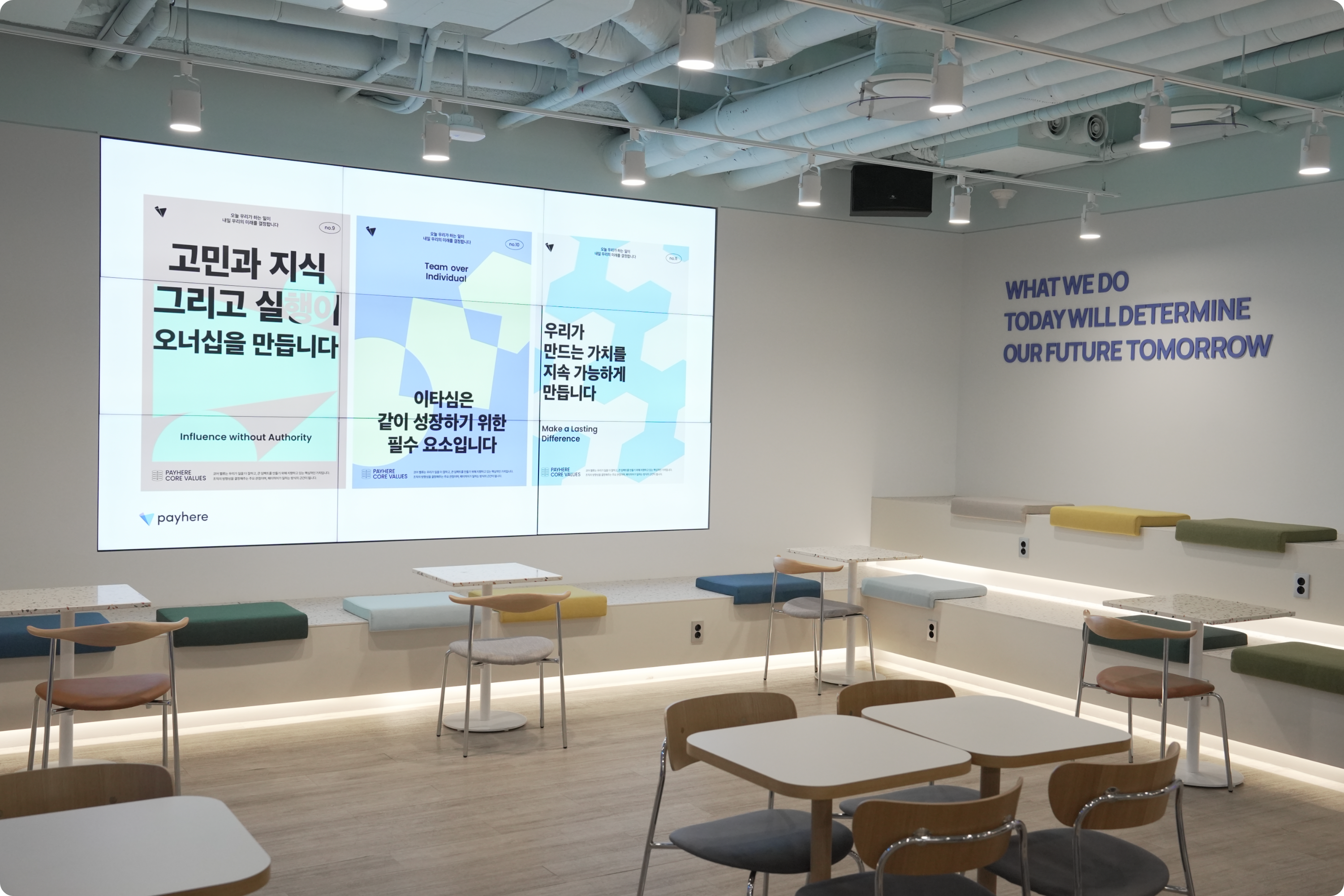 👼🏻 16층에 있는 비전 보드가 기억에 남아요. 페이히어의 코어 밸류 포스터가 계속 돌아가고 있는데, 지나가다 보면 어느새 눈에 익어요. 모니터 크기도 엄청 커서, 뭔가 '우리 회사는 뭘 중요하게 생각하는지'를 계속 리마인드 받는 느낌이에요.
