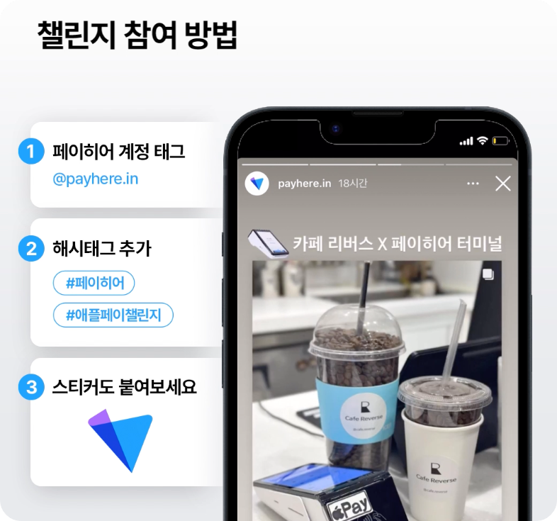 터미널을 사용해 주시는 가맹점 사장님들께서 인스타그램을 통해 애플 페이로 결제가 되는 현장을 다양하게 인증해주고 계신데요, 사장님들과 함께 만들어갈 페이히어 터미널 챌린지도 기대해 주세요!🙂