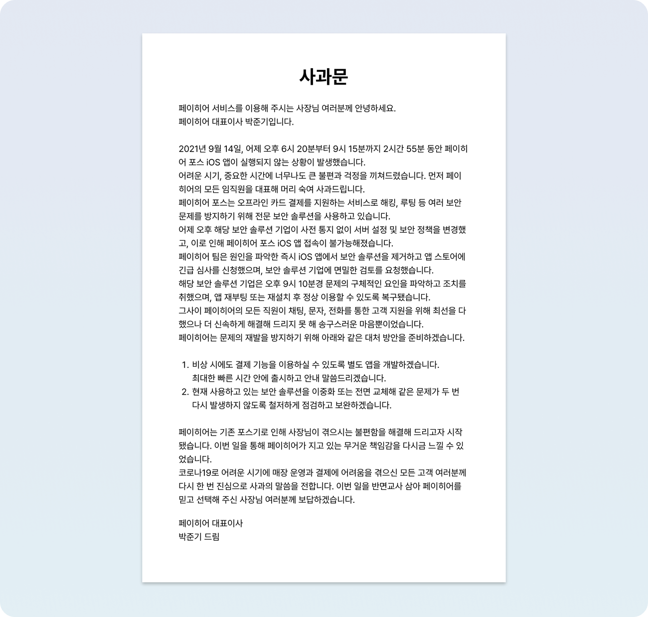 사건 수습 후, 사장님들에게 제일 먼저 사과를 드렸어요. 당시 코로나로 인해 어려운 시기를 겪고 있었는데, 이러한 불상사로 인해 손해를 끼쳐 죄송한 마음이 가장 컸거든요. 우리의 부족함을 인정하고 같은 상황이 반복되지 않도록 대처 방안을 전달해 드렸어요. 제 마음이 와 닿았는지, 정말 다행히도 많은 사장님들이 페이히어를 계속 사용해 주셨고, 어려운 상황에도 불구하고 감사한 말씀을 전달해 주신 분들이 많았어요.