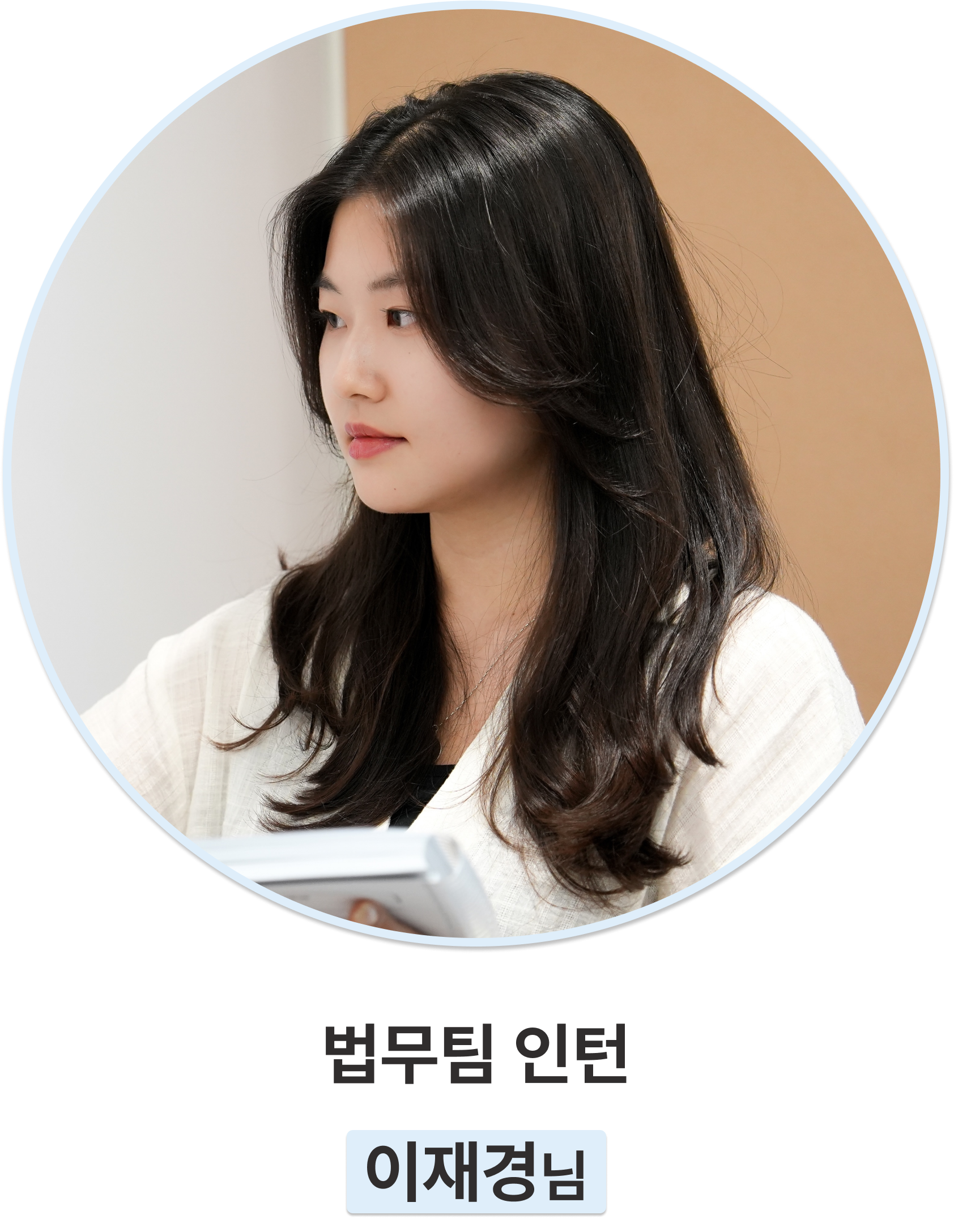재경: 안녕하세요 법무팀 인턴 2개월차 이재경입니다. 주로 법무팀에 계신 사내 변호사님의 업무를 지원하고 시시각각 변화하는 정부 정책과 법률 개정 사항을 모니터링하는 역할을 담당하고 있습니다.