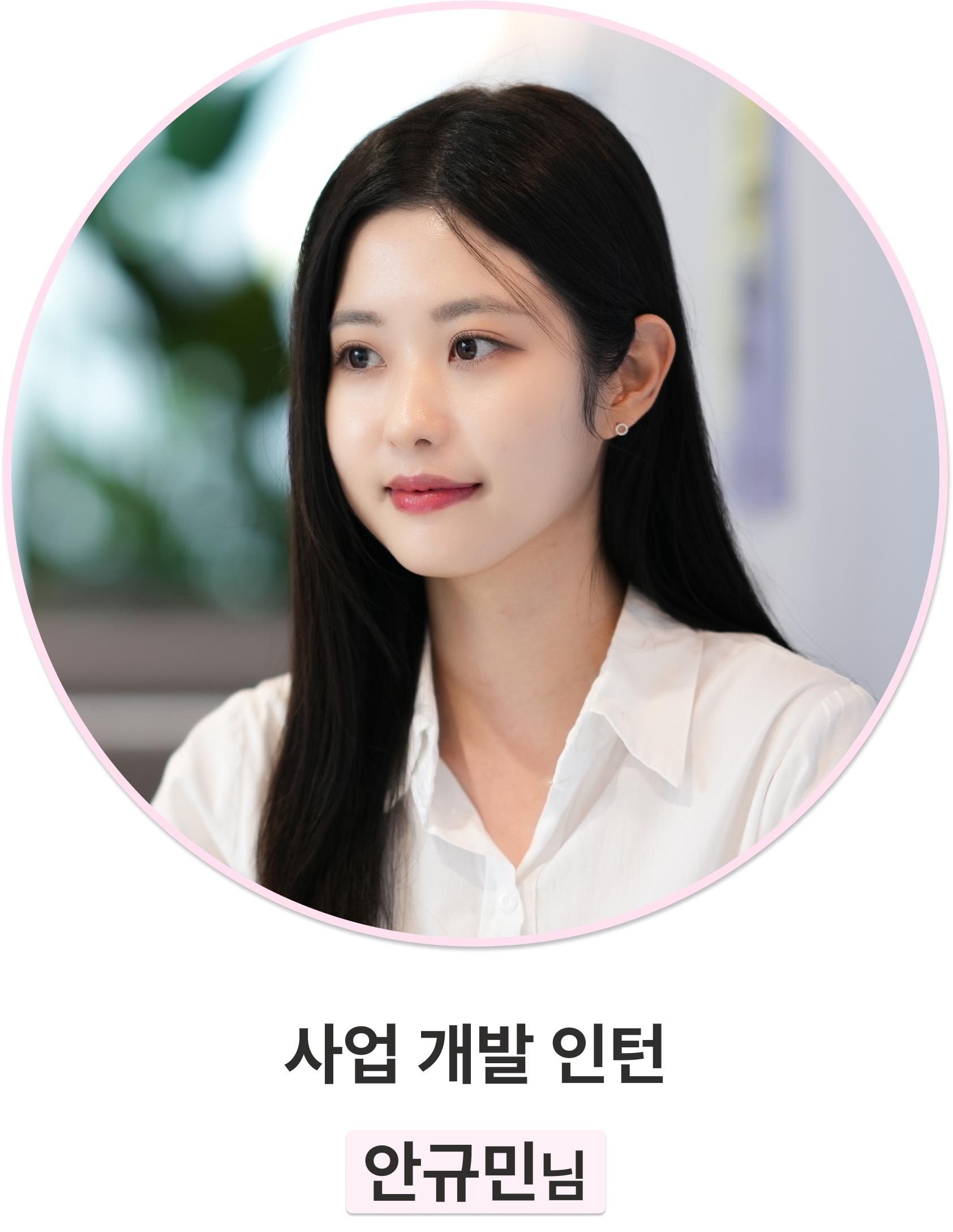 규민: 많은 분들이 사업 개발 인턴 지원 시, 어떤 부분을 강조해야 할 지 고민이 많으실 텐데요. 주도적으로 성과를 만들어 본 경험이나 문제를 해결한 경험이 있다면, 그 인과 관계를 명확히 설명할 수 있는 분이면 좋을 것 같아요! 무조건적으로 높은 정량적 성과만이 중요한 것이 아니라, 내가 해당 문제 및 쟁점을 어떻게 파악했으며, 이를 해결하기 위해 어떠한 인사이트를 도출하여 실행 했는지 등 본인이 얼마나 열정적으로 고찰했는지가 중요하다고 생각합니다. 직면하는 다양한 상황에서 끈기 있게 몰입할 수 있는 분이라면, 누구보다 큰 보람을 느끼며 일할 수 있을 것이라고 확신합니다. :)