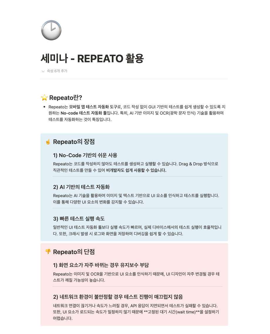 🐰 저희 팀에서 진행하는 세미나가 정말 실용적이라고 생각해요. 🐻❄️님이 세미나에서 자동화 방법을 알려주신 덕분에 지금 모든 팀원이 그 방법을 활용하고 있고, 또 리더님은 테스트케이스 작성법에 대해 가르쳐주셨어요. 일정이 고정되어 있는 건 아니고, 팀원분들이 공유하고 싶은 노하우가 생기면 자연스럽게 세미나를 열게 돼요. 특히 🐻❄️님이 소개해주신 Repeato라는 노코드 자동화 툴이 정말 인상적이었어요. 배운 다음날부터 바로 업무에 적용할 수 있었는데, 복잡한 코딩 없이 화면 이미지만으로 자동화가 가능해서 테스트 효율성이 크게 향상됐어요.