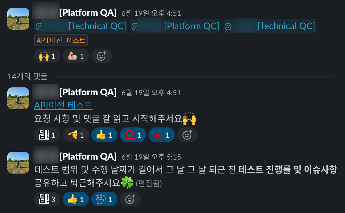🐰 다음 테스트를 수행할 수 있으면 일단 노션에 적어두고 넘어가거나, 이 테스트가 해결이 안 되면 다음 단계로 넘어가지 못하는 경우는 바로 질문하는 방식으로 해결해요. 저희는 이런 질문을 하는 게 정말 쉬운 분위기인 것 같아요. 그렇게 바로 질문해서 해결했어도 모든 히스토리는 다 기록해요. 팀 분위기 자체가 문서화를 중요시하기 때문에 일단 다 기록한다는 게 특징이에요.