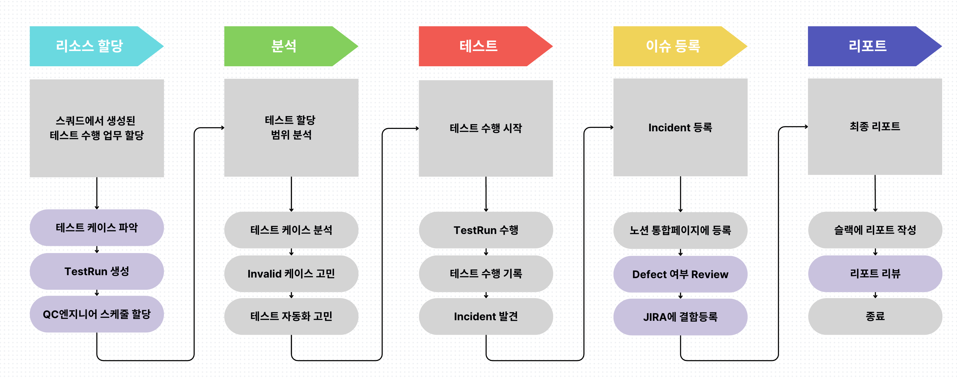 🐻❄️ QC엔지니어라는 포지션이 만들어진 것 자체가 성장을 도와주는 거라 생각해요. QC 업무부터 제대로 할 줄 알아야 QA 업무를 주도적으로 할 수 있다고 생각합니다. 단계별 플로우차트가 있는데, 거기서 QC 업무는 앞의 단계, QA 업무는 그다음에 이어지는 단계를 담당하는 구조예요. 리더님이 만들어주신 성장 경로를 따라가면 정석적인 QA엔지니어가 될 수 있어요. 로드맵이 잘 설계되어 있어서 불필요한 고민 없이 집중할 수 있고, 그래서 안정감도 있어요.