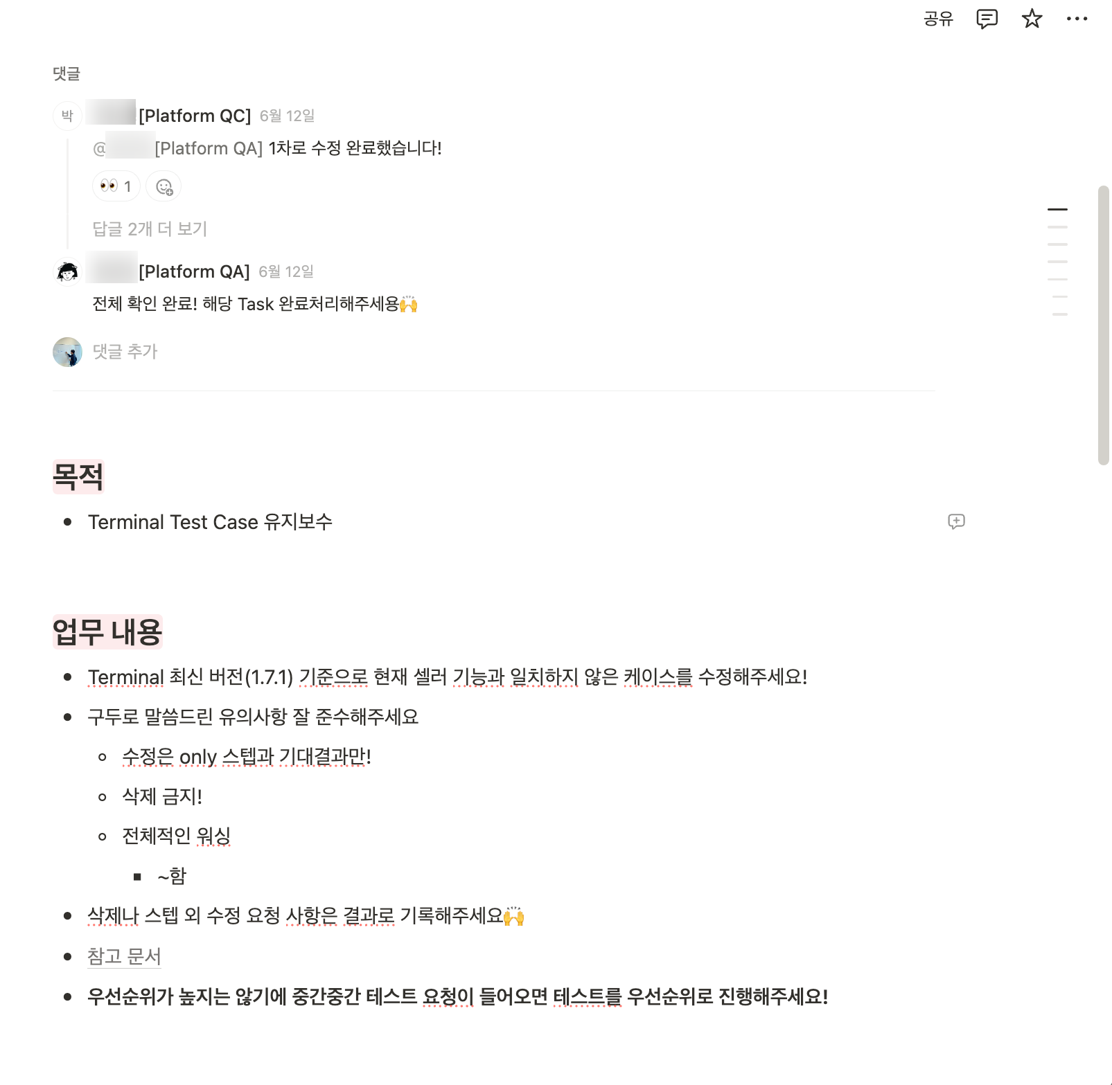 🐥 업무를 하다가 모르는 점이 생기면, 구글링보다 먼저 사내 문서를 찾아보는 게 더 쉽고 빠를 정도로 문서가 잘 정리되어 있어요. 그 덕분에 처음 접하는 기능이나 테스트 케이스도 문서를 통해 방향성을 잡고 시작할 수 있었고, 실제 업무 흐름을 더 빠르게 이해하는 데 도움이 많이 됐어요. '기록하고 공유하는 문화'가 굉장히 체계적으로 자리 잡혀 있다는 점이 인상 깊었습니다.